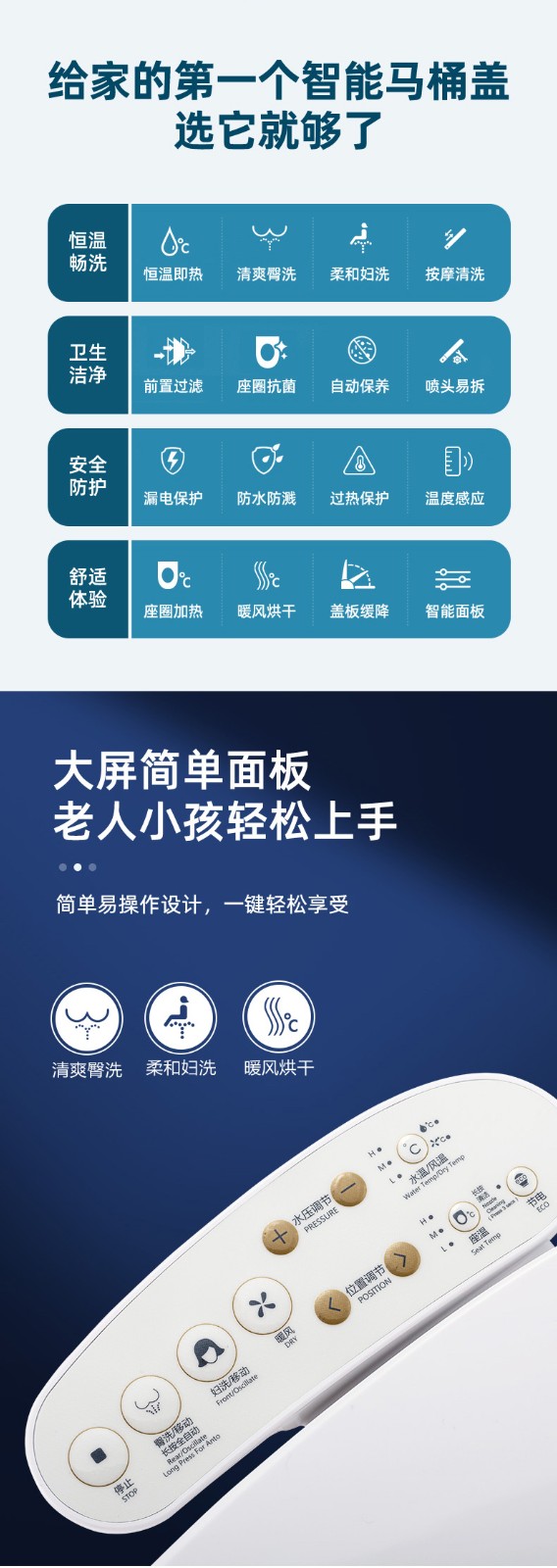 6、4檔風(fēng)溫、水溫、座溫可調(diào)節(jié)、